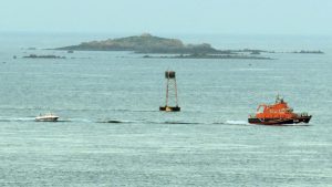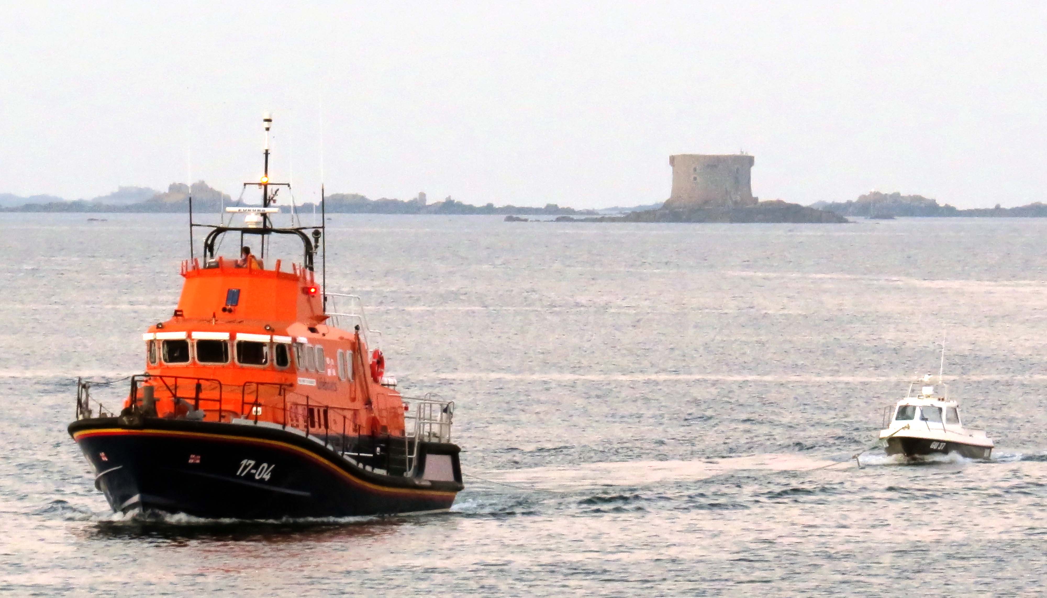 The Lifeboat Spirit of Guernsey towing local Fishing boat past Roustel Beacon as both vessels head for St Peter Port Harbour.