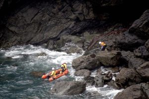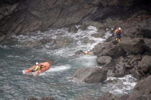 The “Y” boat crew also deserve mention as they managed to retrieve the item of clothing and also noticed an object floating in a cave nearby, returning to the lifeboat they picked up a stretcher, additional crew and returned to the shore area and entered the cave where they discovered the casualty.